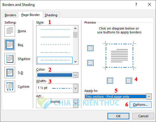 Nhớ đóng khung 4 cạnh cho trang bìa. Phần Apply to chọn This section - First page only để chỉ áp dụng kiểu khung này cho trang bìa đầu tiên. Nhấn tiếp vào nút Options.