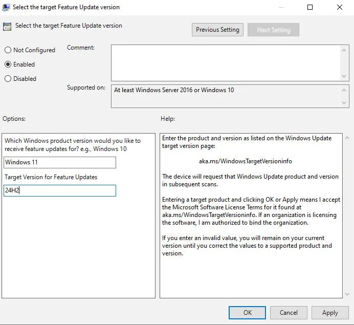 Mặc dù Group Policy ban đầu được thiết kế dành cho máy tính doanh nghiệp, nhưng người dùng cá nhân cũng có thể sử dụng tính năng “Target Version” để chọn giữ lại hoặc nâng cấp lên một phiên bản cụ thể.