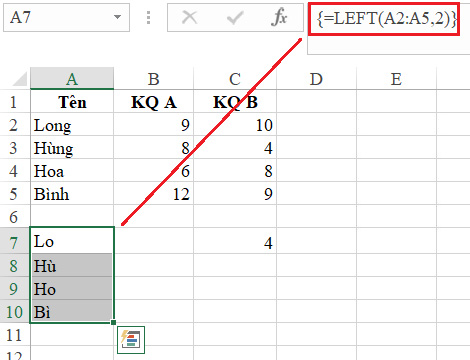 Ví dụ: lấy 2 ký tự bên trái của mỗi phần tử trong mảng từ A2:A5