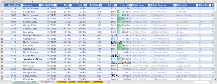 Tại đây, cột A-F và H có giá trị hoặc công thức chỉ sử dụng giá trị trên trang tính và phần còn lại của các cột sử dụng VLOOKUP và các giá trị của cột A (mã khách) và cột B (luật sư) để lấy dữ liệu từ các bảng khác. |