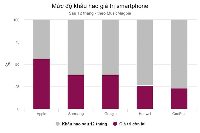 Báo cáo của dịch vụ Musicmagpie cũng cho kết quả tương đồng. Samsung và Google là các thương hiệu smartphone Android giữ giá tốt nhất, với mức độ khấu hao máy vào khoảng 62% sau 12 tháng. Trong khi con số này trên các hãng điện thoại Trung Quốc như Huawei, OnePlus lần lượt là 74% và 77%.