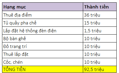 Sau khi đã hạch toán các chi phí mở quán cafe, chúng ta nên lập 1 bảng chi tiết để biết ngân sách cần có là bao nhiêu, kết thúc bước này, bạn sẽ tự trả lời được câu hỏi mở quán cafe cần bao nhiêu vốn rồi đó.