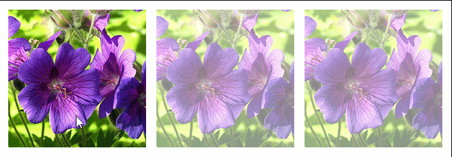 Ở ví dụ trên, đoạn CSS đầu tiên tương tự như code trong ví dụ 1 và thêm hiệu ứng khi người dùng di chuyển chuột qua một trong những hình ảnh thì hình ảnh sẽ rõ lên. Ngoài ra bạn có thể để ảnh ban đầu là rõ nét opacity bằng 1.0 mặc định, sau khi di chuột vào, ảnh sẽ sẽ mờ đi.
