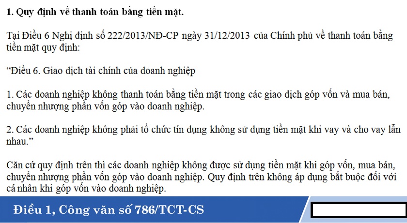Như vậy, căn cứ vào điều 3 của thông tư này, chỉ quy định việc góp vốn kinh doanh từ một doanh nghiệp (pháp nhân) vào một doanh nghiệp khác bắt buộc phải thanh toán không dùng tiền mặt. Và không đề cập đến vấn đề cá nhân góp vốn vào doanh nghiệp bắt buộc không dùng tiền mặt.